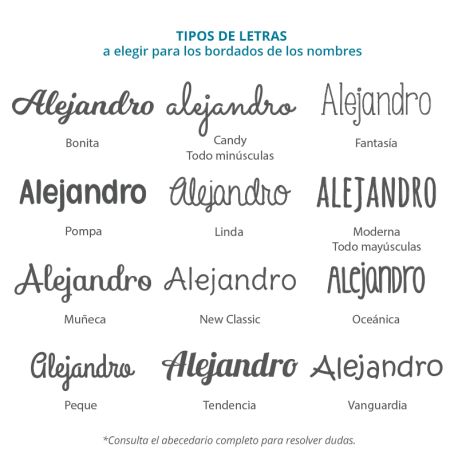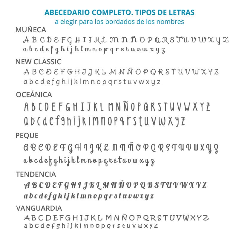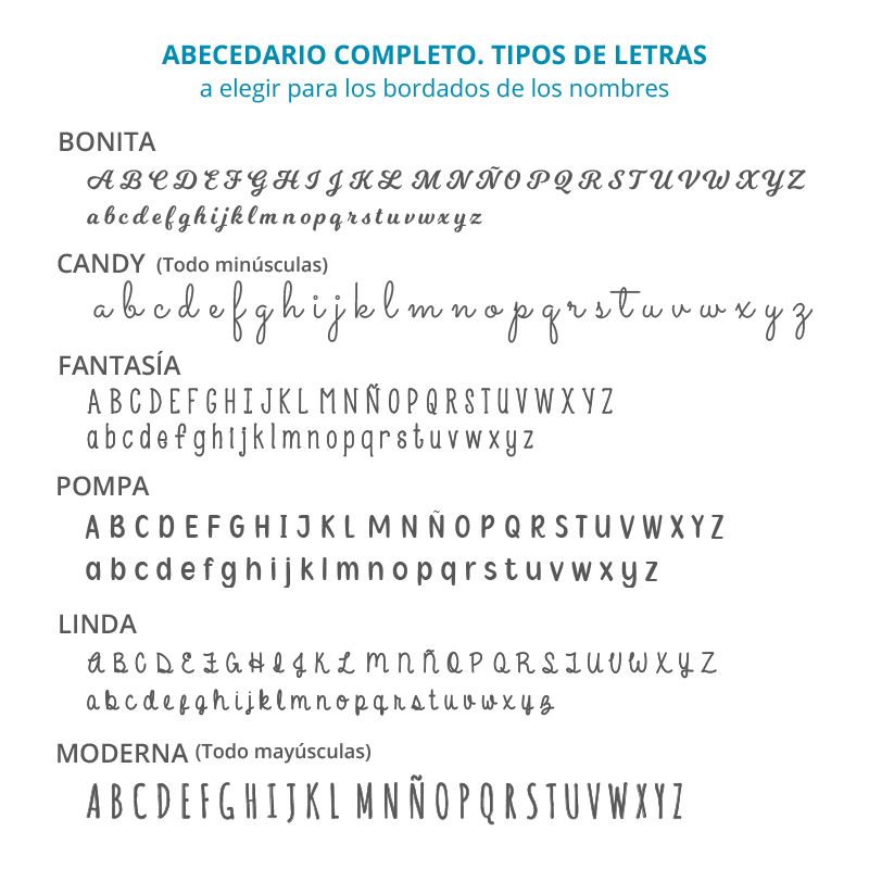 - Se puede elegir color de bordado y tipo de letra para manta dou-dou (el mismo para dos piezas)